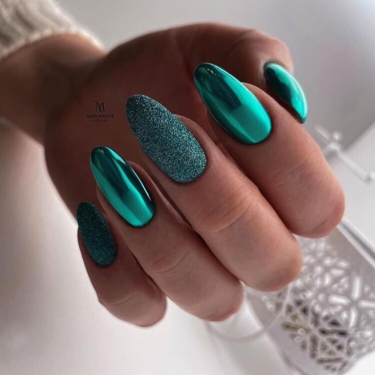 Смарагдовий лак може красуватися і лише на кількох нігтиках, в той час як на інших буде розміщуватися золотий глітер і незвичайні, кілька етно геометричні візерунки та орнаменти.