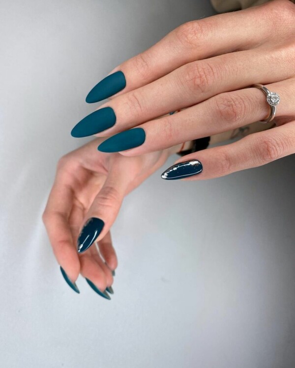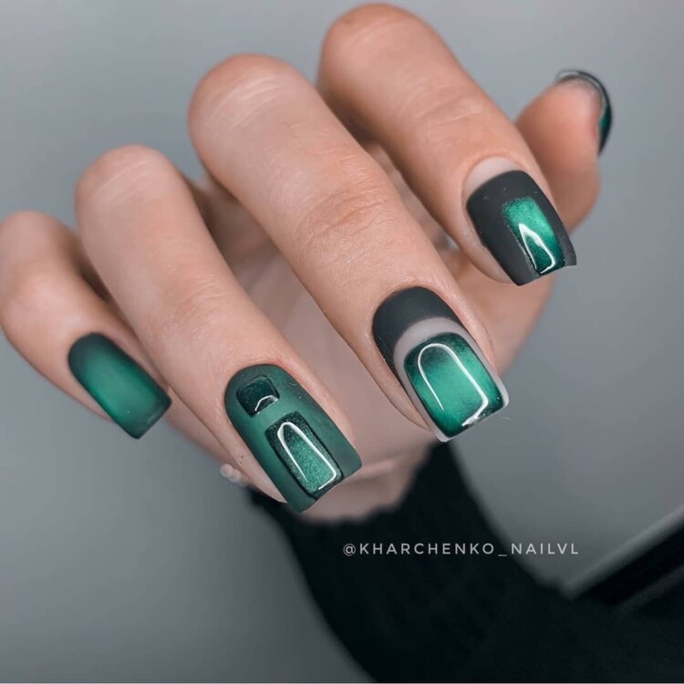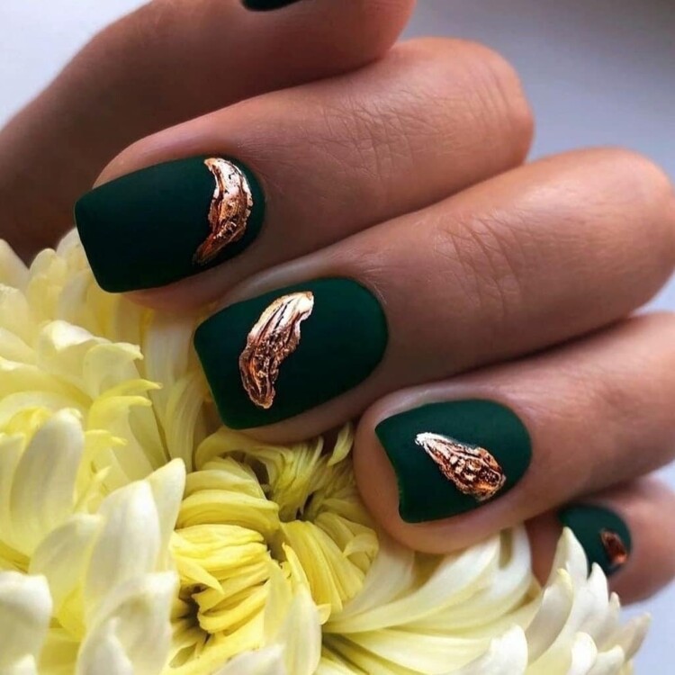 Цікаво буде виглядати на коротких нігтях матовий смарагдовий манікюр, прикрашений поталью або ж візерунком, виконаному в техніці розплавлений метал. Такий дизайн вражає своїм багатством, красою і мінімалізмом.