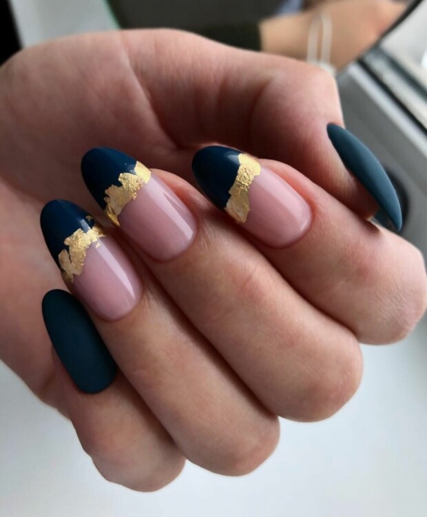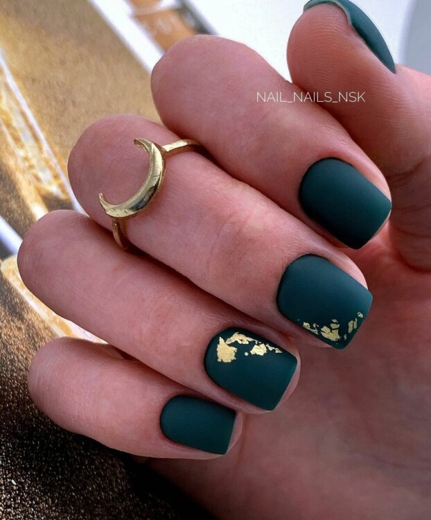 Смарагдовий лак може красуватися і на коротких нігтях. Щоб дизайн вийшов красивим і стильним, доповніть його матовим топом, а також золотою фольгою на декількох нігтиках.