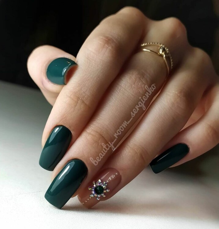 Не забувайте, що смарагдовий манікюр чудово поєднується зі стразами. Однак не переборщіть з цим декором і використовуйте його лише на одному нігтику, наприклад, у вигляді малюнка.
