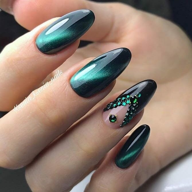Незвичайні і дуже благородні переливи кольору на смарагдовому покритті можна отримати і за допомогою магнітного лаку. Доповнивши дизайн стразами на одному нігті, ви отримаєте дуже вишуканий і лаконічний манікюр.