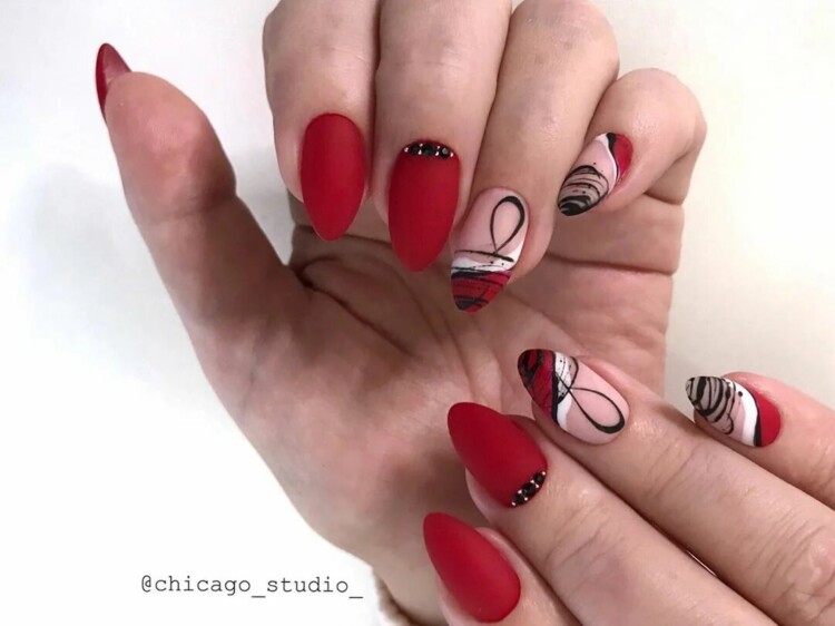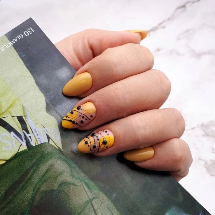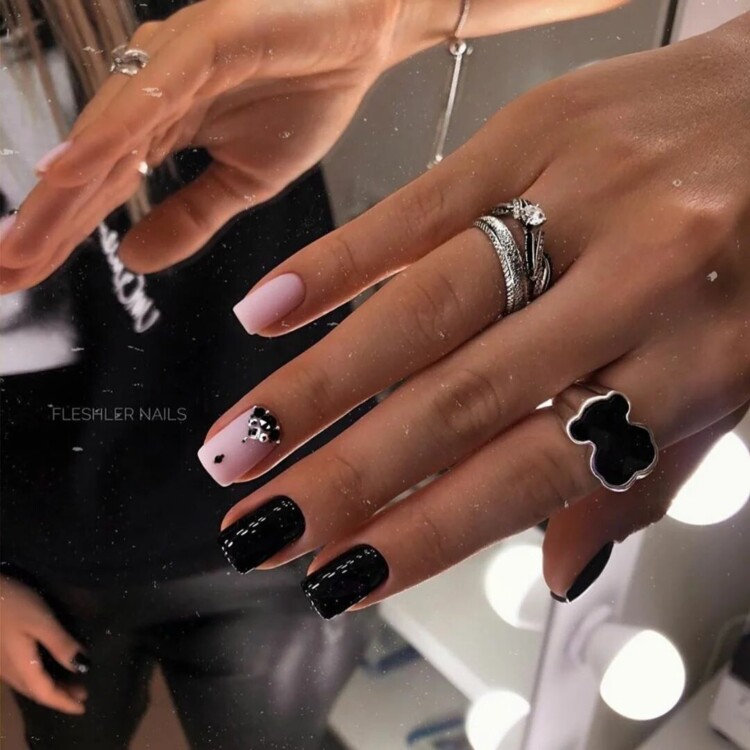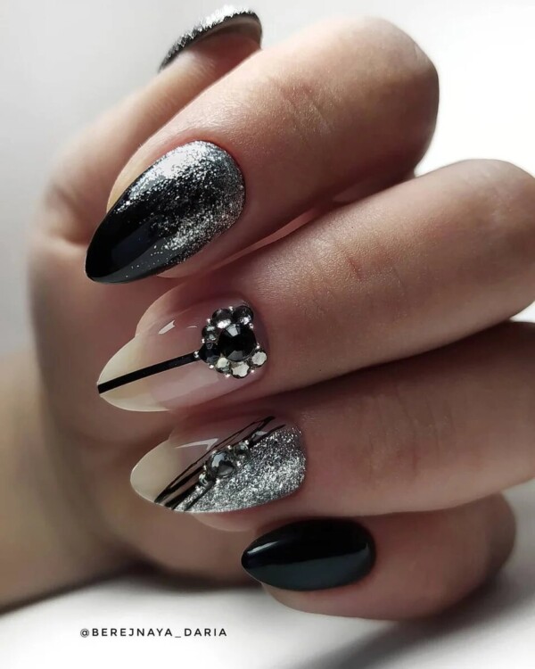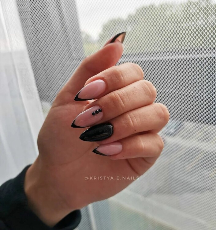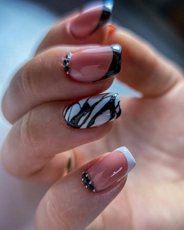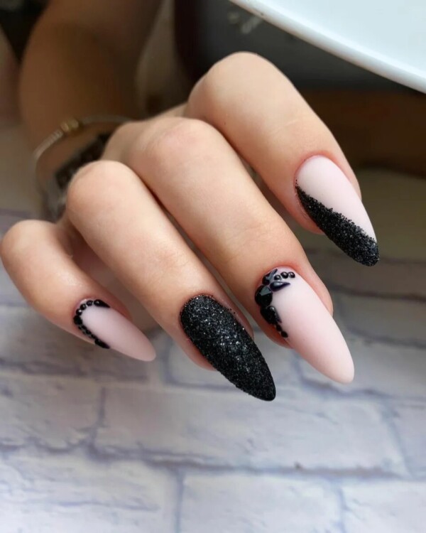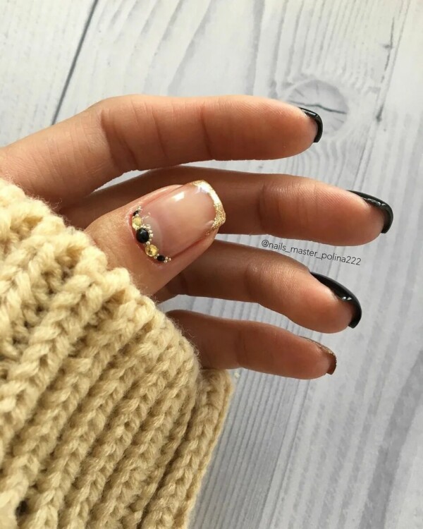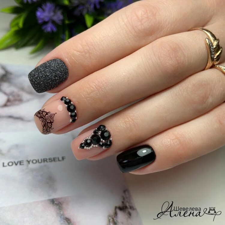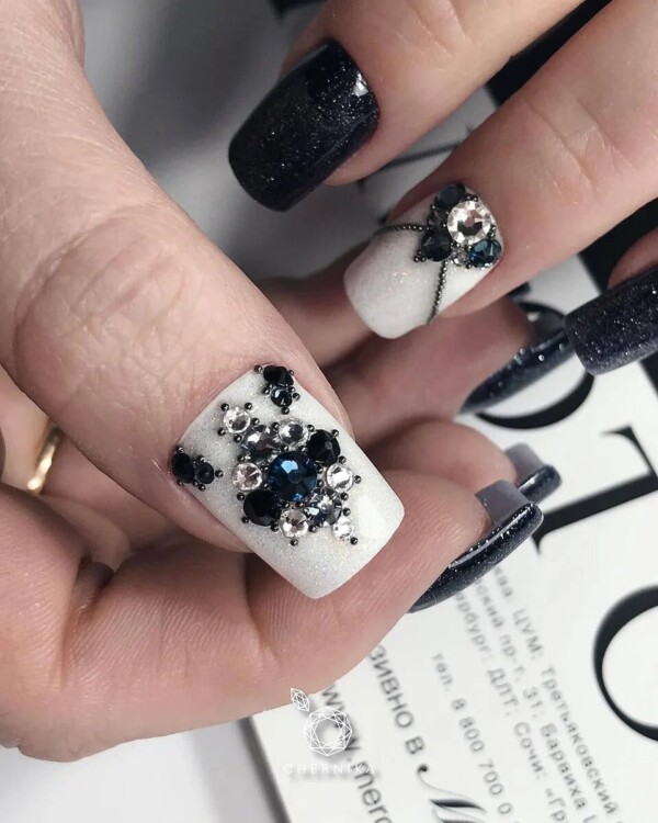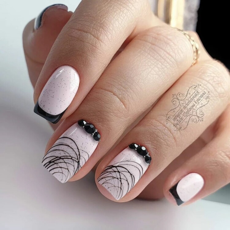 Нерідко чорні стрази можна зустріти і в досить складних дизайнах, наприклад, в парі з павутинкою, технікою перепелине яйце, омбре, абстракцією, геометрією і так далі.