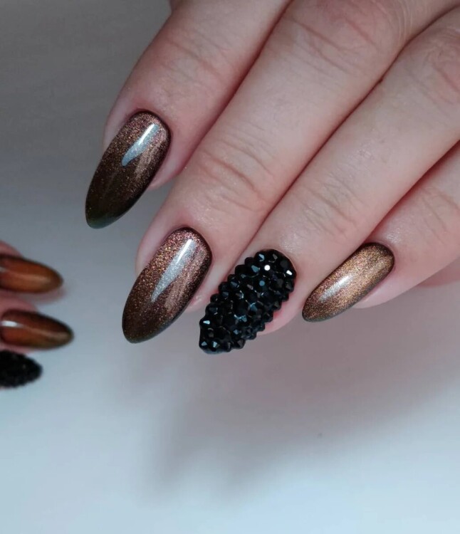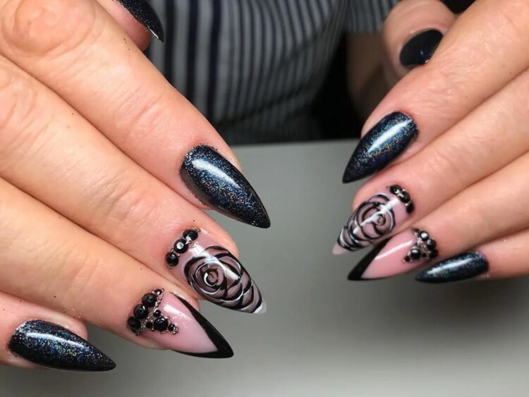 Чорні стрази – це дуже ефектний декор, який чудово виглядає як в повсякденному, так і вечірньому манікюрі. Найбільш часто такі темні камені починають використовувати в дизайні в холодний сезон. У цьому випадку він чудово доповнює малюнки, техніки і робить нейл-арт більш насиченим і привабливим.