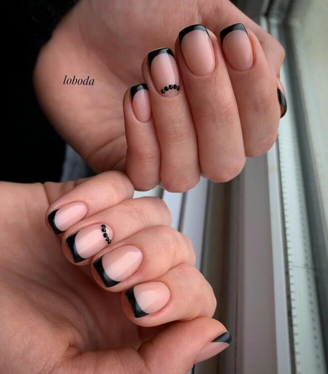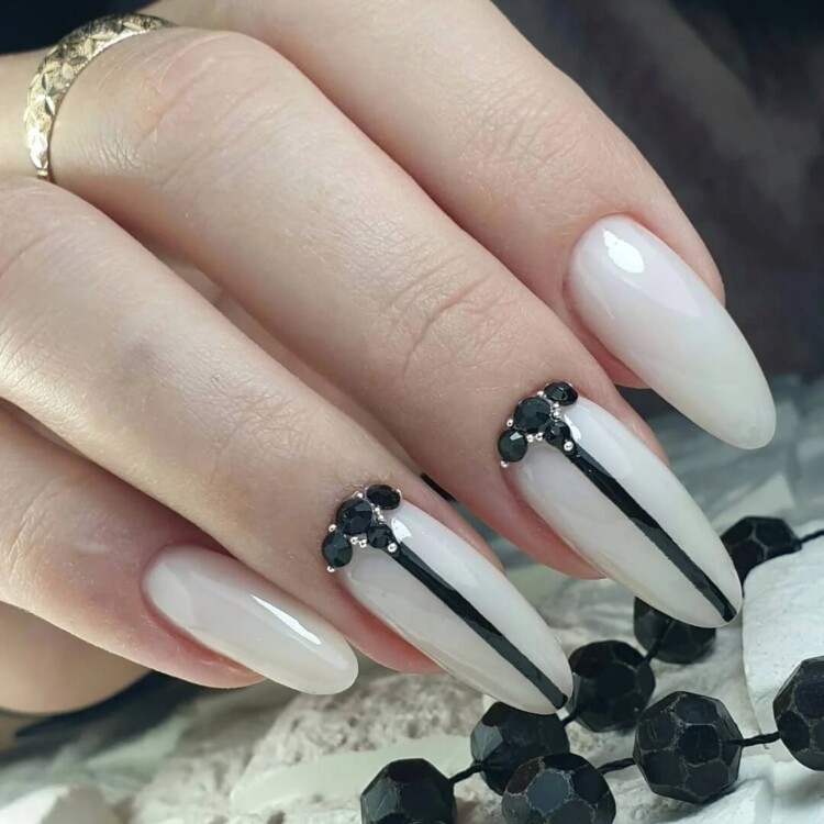 Однак найбільш часто чорні стрази використовуються як доповнення до вже готового дизайну. Наприклад, прекрасно вони виглядають в парі з благородним білим класичним френчем або на молочному однотонному манікюрі. Принаймні, в останніх двох випадках манікюр прекрасно працює навіть в повсякденних образах.