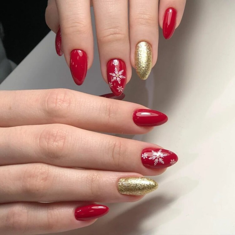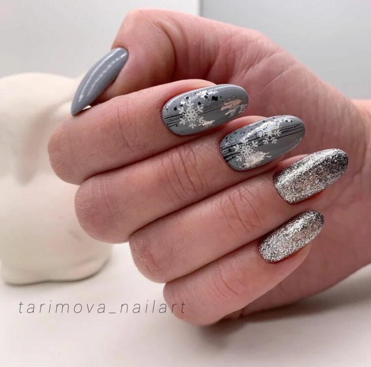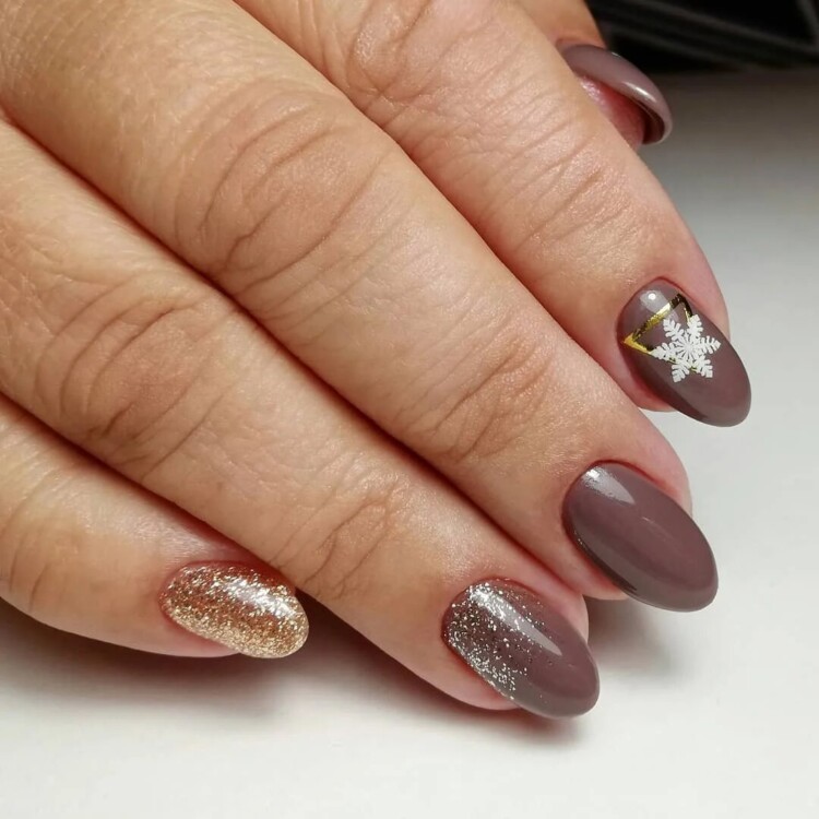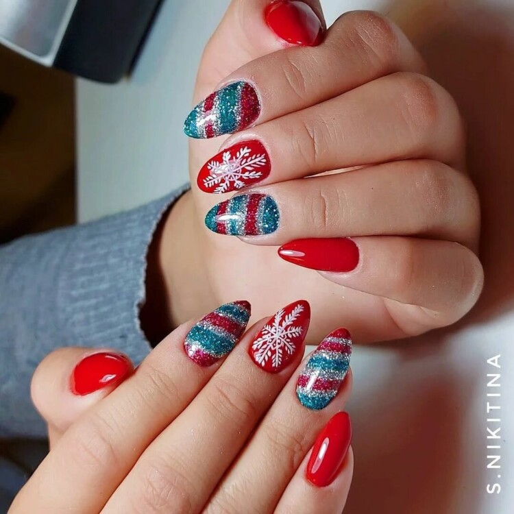 Використовують в парі зі сніжинками також глттер. Він може бути абсолютно будь-якого відтінку, додасть в манікюр святкового настрою. Така ідея дизайну прекрасно підійде для Нового року.