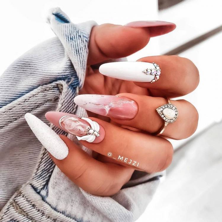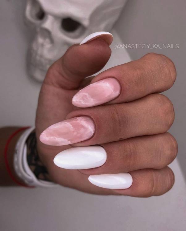 Головним трендом нейл-індустрії є білий мармуровий дизайн нігтів. Білий тон найкраще демонструє всю красу та ексклюзивність мармурового малюнка. При створенні манікюру нігті покриваються білим лаком, після чого малюнок наноситься за допомогою темних або пастельних відтінків таким чином, щоб візуально точно передати візерунок натурального каменю.
