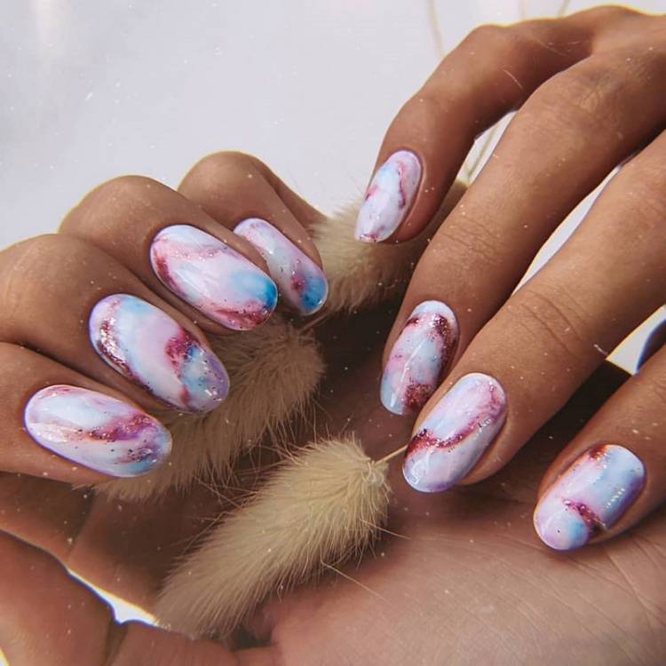 «Ефект мармуру» можна створити на всіх пальцях одночасно або як акцент на 1-2 нігтиках. Додатковими елементами для мармурового дизайну будуть служити стрази, втирання, фольга і блискітки.