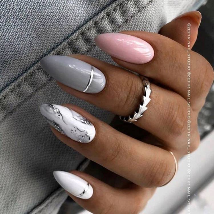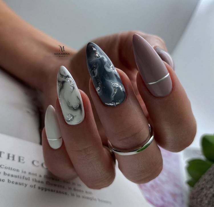 “Ефект мармуру” круто виглядає в комбінації чорних і білих тонів, яку можна доповнити блискітками або фольгою. Нейл-майстри довершують білим дизайном яскраві або пастельні нігтики, що, зрештою, виглядає дуже стильно та вишукано.