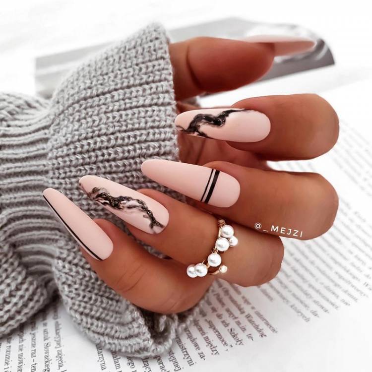 Нюдовий манікюр з білим або рожевим мармуром стане універсальним варіантом для будь-якої нагоди, а для урочистої версії просто довершіть дизайн шматочками фольги або блискучими смугами. Розкішним вибором є чорний манікюр у комбінації з нюдовими нігтиками, які будуть доповнені чорним мармуром та золотом.