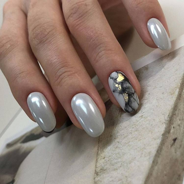 Великою популярністю серед представниць прекрасної статі користується манікюр з мармуром і фольгою. Якщо Ви хочете досягти «wow-ефекту» на мармурових нігтиках, попросіть Вашого майстра додати трохи золотистих, сріблястих або рожевих акцентів за допомогою фольги.