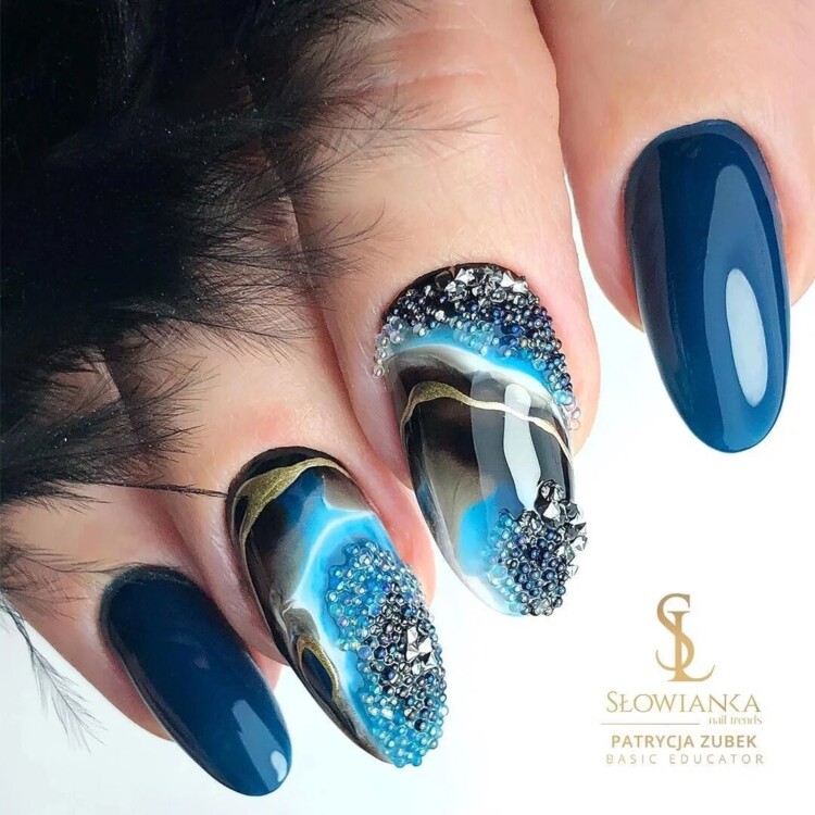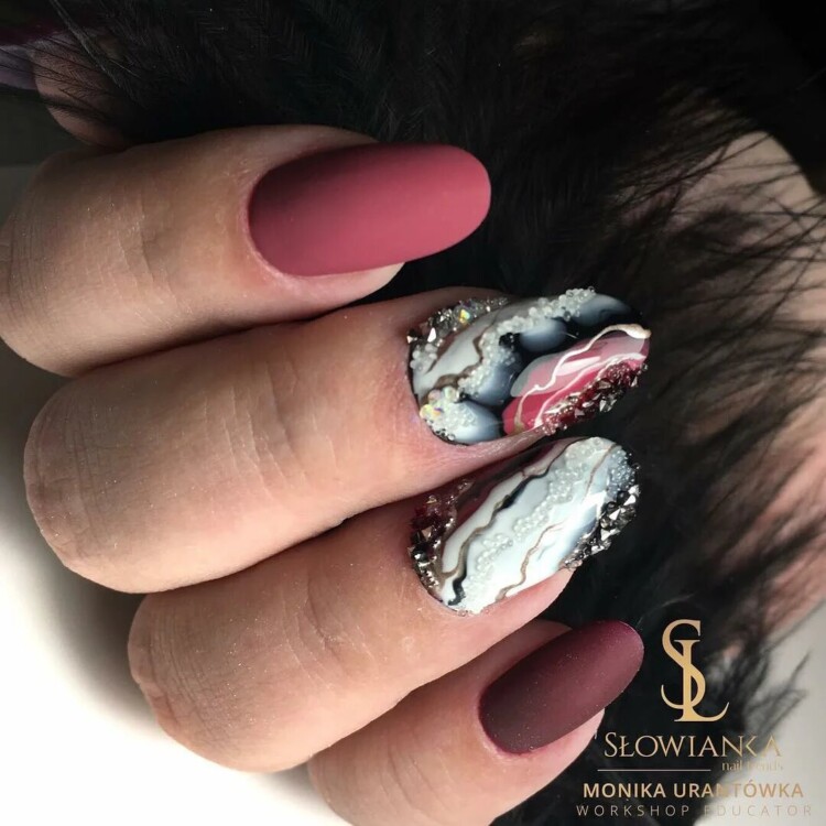 Як і в попередньому випадку, для досягнення ідеального ефекту майстри використовують різноманітні техніки промальовування. А найкреативніші пускаються в справжні експерименти і за допомогою багатошаровості створюють справжній ефект розрізу турмаліну, аметисту, агату і так далі.