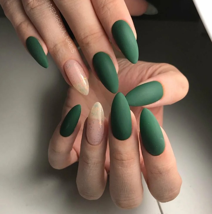 Цей колір шикарний навіть у монохромному варіанті. Найпопулярніші відтінки 2022 року – арлекін, зелений Крайола, смарагд та кленовий. Такий дизайн актуальний як улітку, так і взимку. На довгих нігтях це втілення естетики, якщо це форма нігтів мигдаль. Відтінок відмінно поєднується з блакитним, рожевим, чорним та лимонним. Незвичайно виглядає тандем з місячним дизайном та об’ємною 3D-ліпкою.