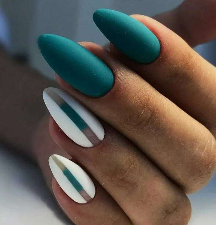 Найсвіжіший і надихаючий колір добре поєднується з сірим, чорним, рожевим і жовтим. Це один із найпопулярніших відтінків літа. У матовому виконанні такий дизайн вражає своєю неповторністю та стильним виглядом. Спробуйте поєднувати цей лак із золотом, чорними лініями та градієнтом. Також неймовірно виглядатимуть наклейки з написами або візерунки, виконані за допомогою стемпінгу.