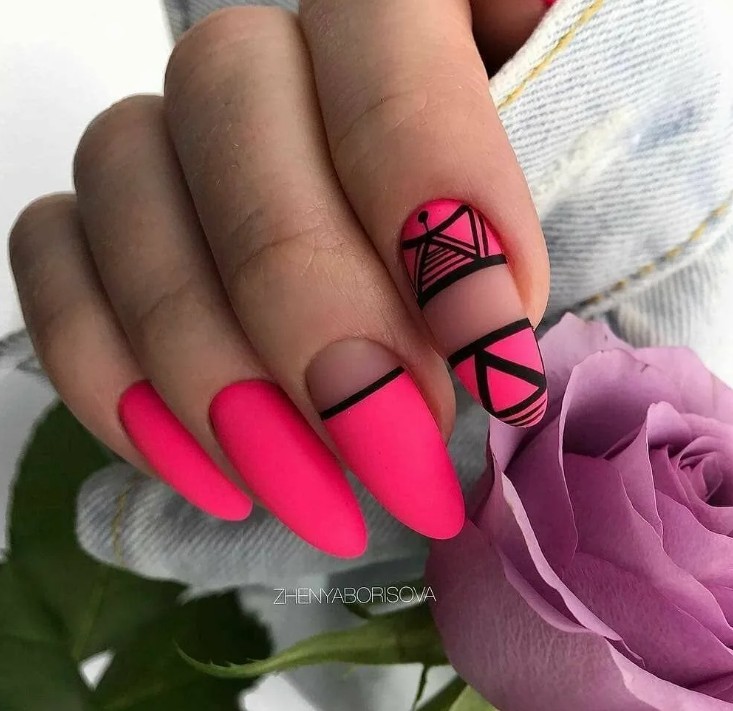 Дуже молодіжно і новомодно виглядає матовий топ із дизайном «негативний простір». Такий манікюр сподобається будь-якій дівчині, яка прагне не відставати від моди. В даному випадку частина нігтя залишається незакрашеною або покривається прозорим лаком. Малюнки можуть бути будь-якими – чіткими, хаотичними або симетрично намальованими. Кожне оформлення виглядає цікаво та незвично.