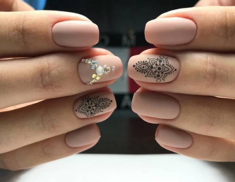Цей колір надає ручкам доглянутого вигляду. Матовий манікюр у такому кольорі виглядає природно та натурально. Він гармонійно поєднуватиметься з будь-яким образом і доречно підійде під будь-який захід. Цей дизайн шикарно буде виглядати зі стразами, невигадливими візерунками, у техніці «в’язаного» манікюру та з павутинкою.