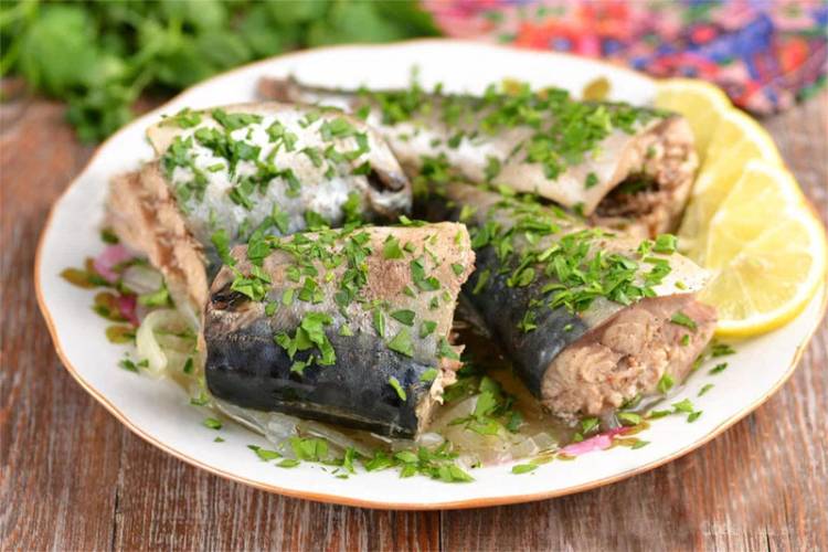 На іншу тарілку викладаємо всю цибулю з каструлі, зверху розміщуємо шматки скумбрії. Поливаємо соком лимона, невеликою кількістю олії (можна і без неї), посипаємо перцем, дрібно нарізаною петрушкою і подаємо на стіл із гарніром. Риба виходить соковитою, за рахунок спецій та цибулі ароматною та смачною.
