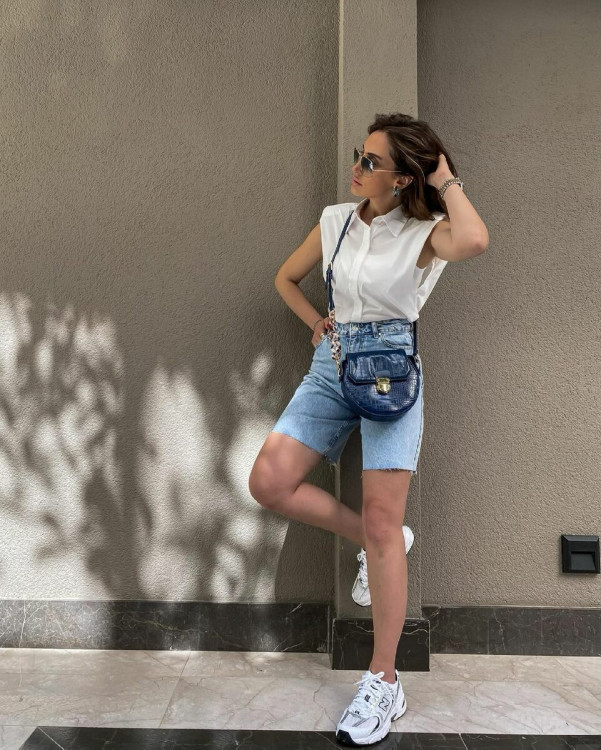 Ще один простий, але стильний образ на практично всі повсякденні випадки життя можна зібрати з джинсових шорт і сорочки без рукавів. Стильні аксесуари обов’язкові!
