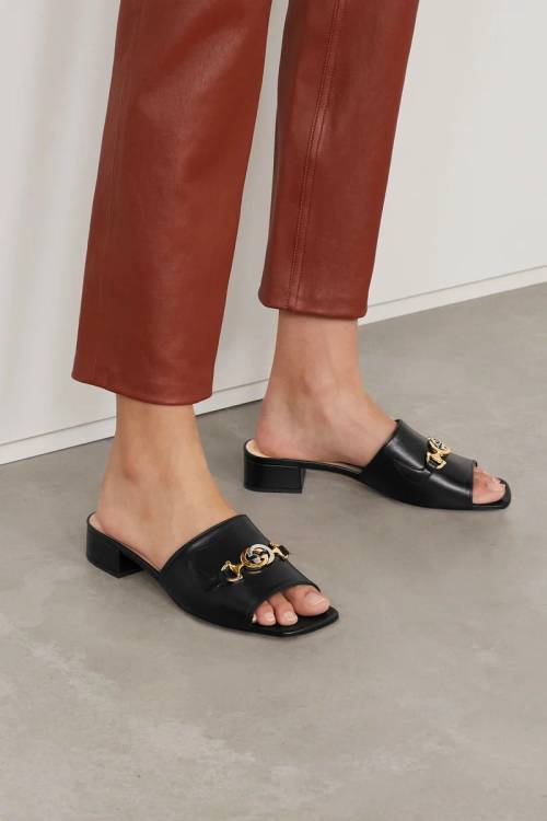 Взуття на кожен день може виглядати так: шкіряні сабо на невисокому каблучці з золотою акцентною фурнітурою.