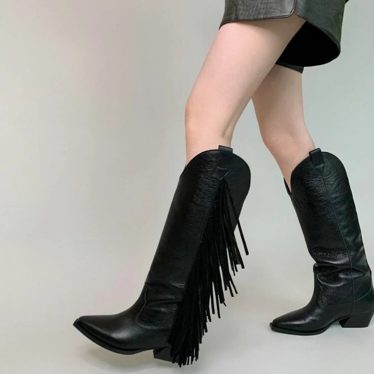 Любителькам стилю бохо і етнічних мотивів в образі припадуть до смаку трендові чоботи з декором у вигляді бахроми. Їх можна поєднувати з сукнями, спідницями (в тому числі довгими) і іншими жіночними нарядами. Для такого взуття краща наступна колірна палітра: