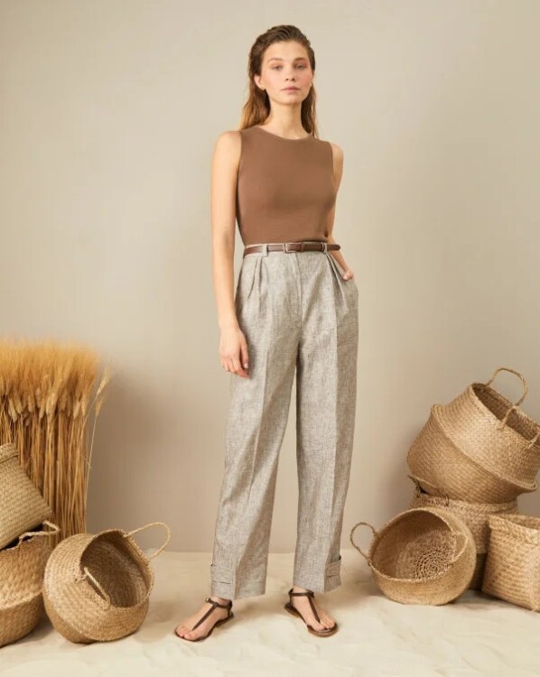 Ідеальним варіантом для стилю мінімалізм будуть штани класичного прямого крою, широкі моделі і брюки кльош від стегна. З завищеною талією. Виконані з натуральних якісних тканин. Кольорова гамма: білий, чорний, сірий, коричневий, бежевий, синій, зелений, графітовий. Без додаткового декору, за винятком ґудзиків в колір штанів або на кілька тонів темніше ніж самі штани.