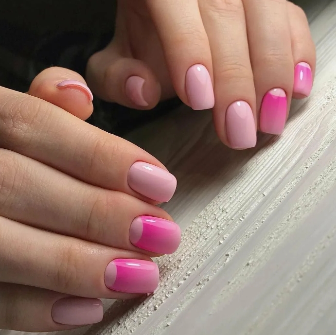 Френч актуальний завжди, але в рожевому кольорі він виглядає набагато крутіше. Відійдіть від класики та покрийте лінію «усмішки» гель-лаком кольору фуксія. Також можна спробувати змінити форму краю. Цікаво буде виглядати трикутна “усмішка” або твіст-френч. У другому випадку актуальним є поєднання рожевого з фіолетовим, синім, ліловим кольором.