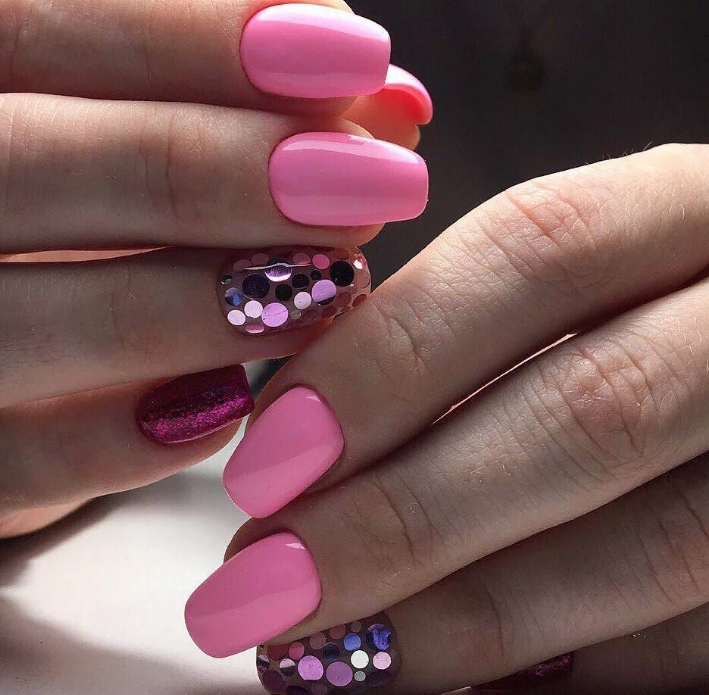 Якщо ви маєте намір зробити святковий рожевий манікюр, можна поекспериментувати з елементами декору. У моді стрази, каміфубуки, паєтки, блискітки і намистинки – їх можна додавати як на один ніготь, так і на кілька. Але не перестарайтеся! Декор у великій кількості робить манікюр вульгарним, це виглядає безглуздо і зухвало.