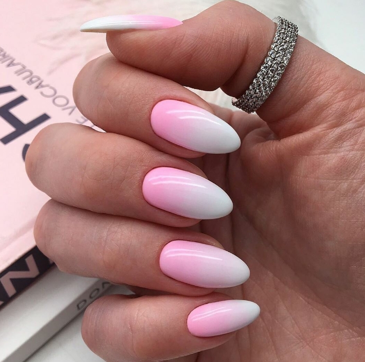Навесні у моді техніка градієнт. Плавні переходи відтінків виглядають стильно та оригінально. Найпопулярнішим варіантом буде горизонтальний градієнт, коли темні або яскраві кольори переходять до світліших та ніжніших. Вертикальні переходи виглядатимуть незвичайніше. Рекомендується використовувати ніжні тони. Для створення ефектного дизайну можна додати небагато прикрас.