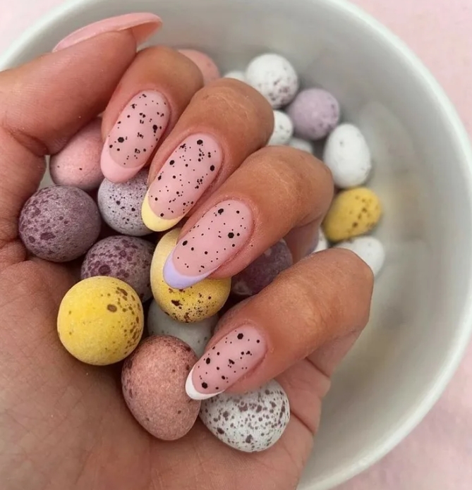 Якщо у вас виникло бажання зробити неординарний дизайн, можна спробувати манікюр «перепелине яйце». Нігті покривають улюбленим відтінком рожевого, а зверху додають дрібні крапки чорного кольору. Це новий тренд у світі нейл-індустрії, що виглядає дуже круто.