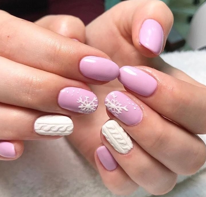 Найзимовіший дизайн — «в’язаний манікюр», коли кожен ніготь ніби одягнений у теплий светр. Таке оформлення приносить спокій і виглядає дуже затишно. Гарно виглядатиме тандем рожевого та сірого кольору. А якщо увімкнути фантазію та додати відтінок абрикосового, то вдасться створити по-справжньому ефектний манікюр. Здаватиметься, ніби на нігтях мороз викував візерунок, тільки не в синій палітрі, а в рожевій.