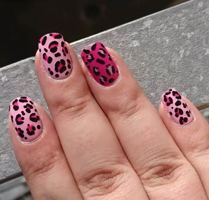 Леопардовий принт на рожевій підкладці виглядає ефектно. «Хижий» малюнок зазвичай вибирають яскраві дівчата, які люблять бути у центрі уваги. Цей тренд деякий час не мав попиту, але в 2022 році знову входить у модні тенденції. Якщо покрити нігті ще матовим топом, ефект буде неймовірним.