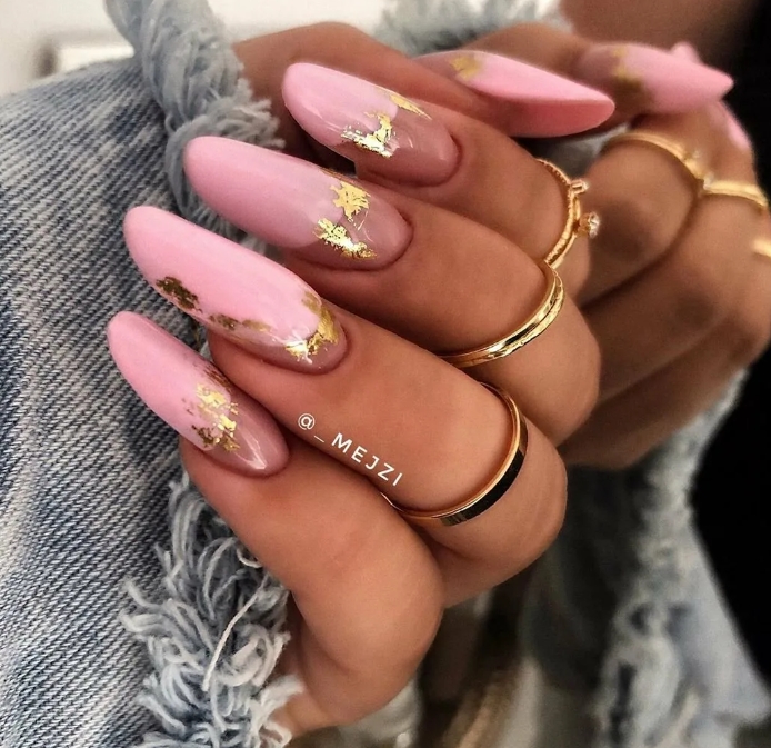 Це одна з найкрасивіших новинок 2022 року. Фольга надає нігтям нотку шарму та епатажу, з нею манікюр миттєво набуває дорогого вигляду. Золоті елементи завжди створюють неймовірний ефект. Манікюр підійде на будь-який випадок життя, ви можете вибрати такий дизайн навіть на весілля.
