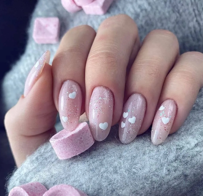 Це дуже ніжний дизайн, який люблять вибирати дівчата-романтики чи милі дівчатка. Також такий дизайн має попит на день Святого Валентина. Маленькі серця на рожевому фоні виглядають лаконічно і стримано. Манікюр простий, але виглядає чарівно.