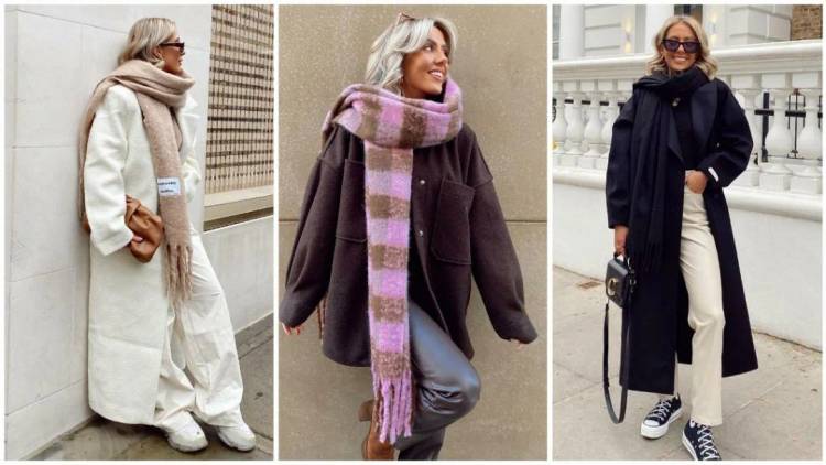 На піку моди осені 2022 моделі шарфів у стилі оверсайз різних відтінків беж. Вони чудово поєднуються з будь-яким кольором одягу. Щільні та довгі моделі слід носити, перекинувши один кінець через плече.