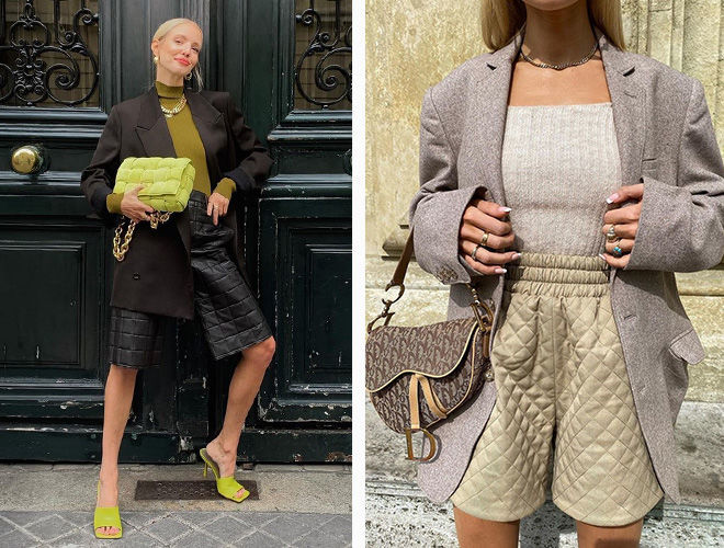 Стьобані шорти – не новинка, їх дизайнери презентували нам ще кілька сезонів тому. Незважаючи на те, що великою популярністю вони не користувалися, все ж таки побачити їх на стрітстайл-виходах або популярних українських it girl можна. Виглядають такі шорти самобутньо та оригінально, особливо добре виглядають у шкірі. Рекомендую носити їх із мюлі на невеликому підборі або модними гостроносими слінгбеками.