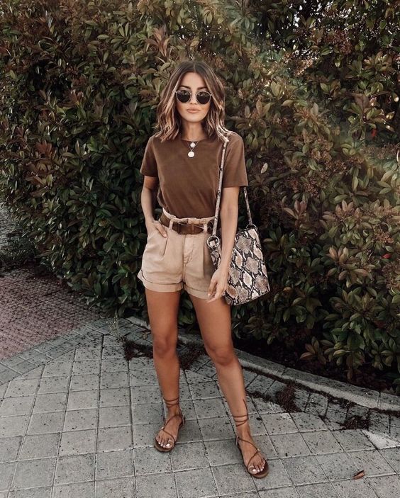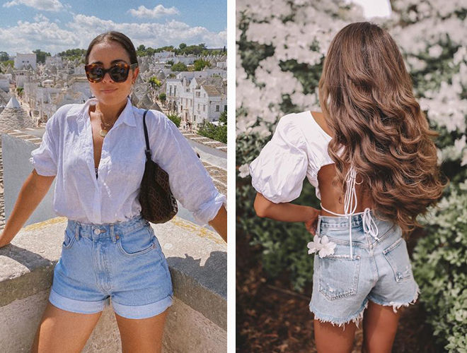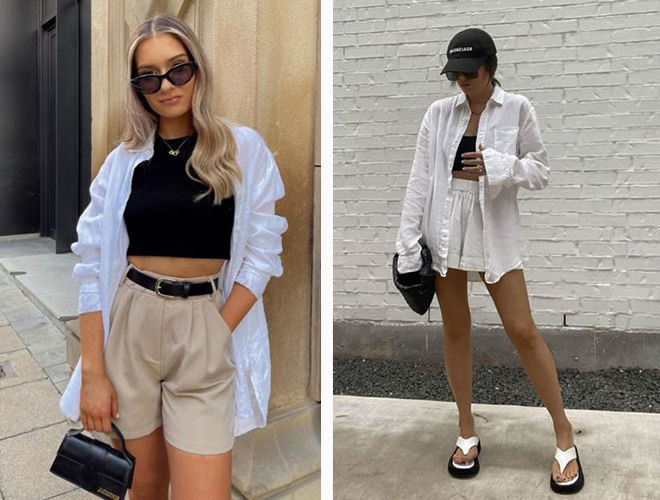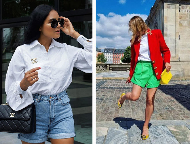 Цього літа носіть білий верх з подовженими джинсовими шортами, кольоровими мюлі та невеликими сумочками або з трохи вільними моделями з підворотами разом із сандалями на масивній підошві та об’ємними шопперами. Дуже елегантно в такому поєднанні виглядатимуть аксесуари у коричневому кольорі або з анімалістичними принтами у натуральних відтінках.