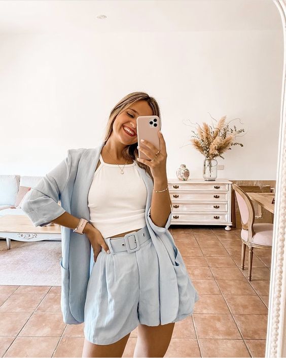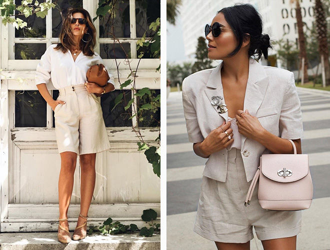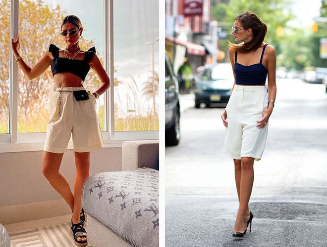 Шорти-бермуди відмінно поєднуються з трендовими кроп-топами. Такий образ на всі 100% підходить для міста та доречний як на прогулянці, так і на побаченні. Вибирайте яскравий верх, варіанти із зав’язками, вузлами або незвичайними рукавами. Якщо плануєте надіти жакет або сорочку із щільної тканини, підберіть під них мінімалістичні моделі або зовсім придивіться до бра, які люблять усі світові it girl.