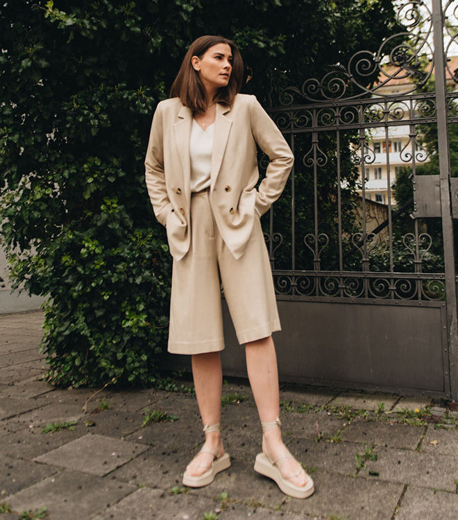 Льон – виключно літній матеріал, легкий та комфортний. Він класно виглядає з легкими тканинами: шовком та тонким трикотажем, денімом. Я б взяла лляні шорти в комплекті з таким же верхом для розслабленого образу. Льняний одяг виглядає дорого і підходить жінкам різного віку.