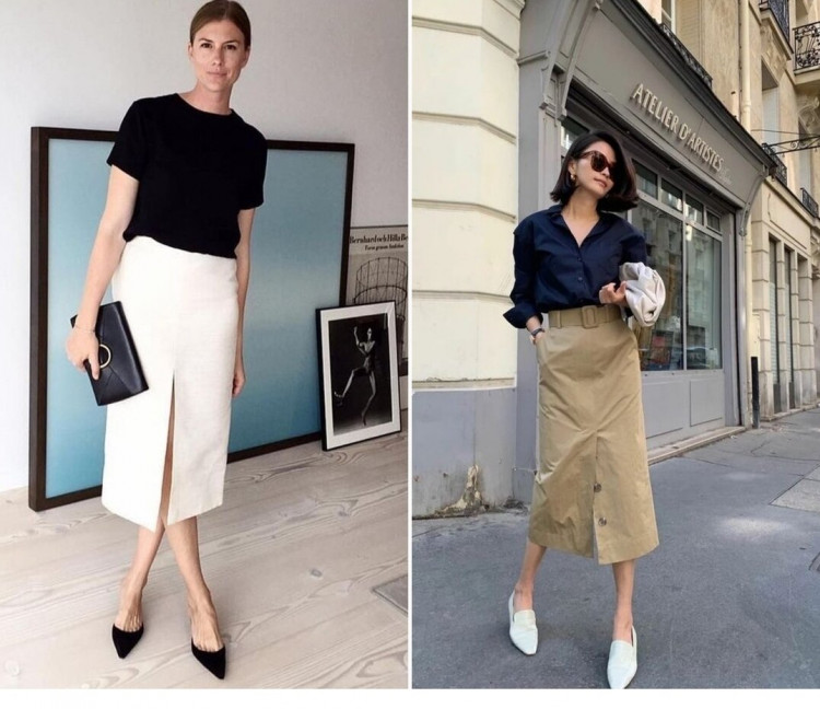 Якщо ставите питання, що носити влітку в офіс, то пряма міді-спідниця – це прекрасний варіант. По суті, це сучасне прочитання спідниці-олівець, тільки в більш “правильній” довжині. Принципова відмінність – в посадці, спідниця-олівець сидить вільніше, а не обтягує (що в спеку було б набагато неприємніше). І ніякої заниженої талії, щоб не було ефекту коротких ніг.