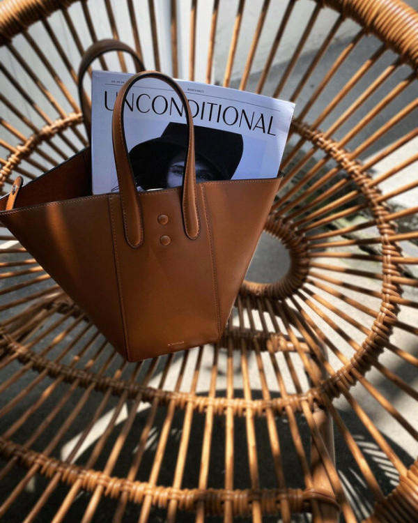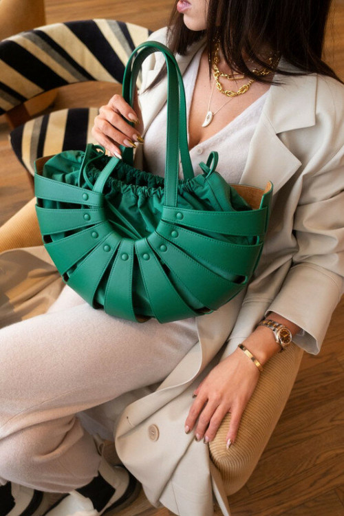 Каркасна сумка візуально нагадує перевернуту піраміду з короткими шкіряними ручками – ще одна модель сумки, яку можна часто побачити в шикарних образах знаменитих фешн блогерів.