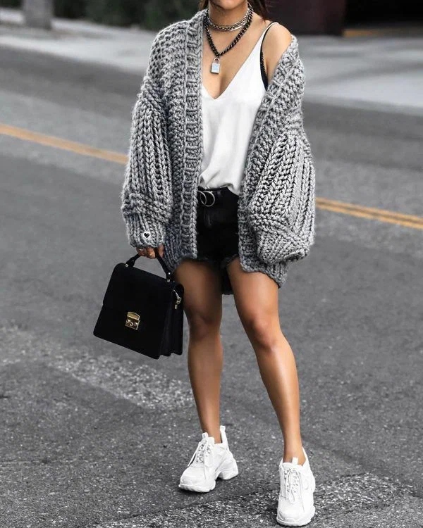 До речі, якщо виберете дуже теплий кардиган із щільної тканини, він може замінити вам те ж демісезонне пальто. Найчастіше, звичайно, такі не мають застібок. Але це варто розглядати як якусь “родзинку”. Ви можете закріпити обидві сторони цікавим ременем, зробивши цим і вигідний акцент на талії, і урізноманітнивши сет загалом.