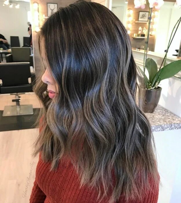 Холодний еспресо і карамельно-попелясті тонкі акценти. Це одне з наймодніших поєднань в цьому сезоні. Власниці темного волосся обов’язково спробуйте таке фарбування!