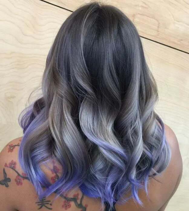 Ще один зимовий прохолодний варіант складного фарбування. Попелястий і блакитний з фіолетовими кінчиками відмінно поєднуються між собою і дають не надто холодний колір в результаті.