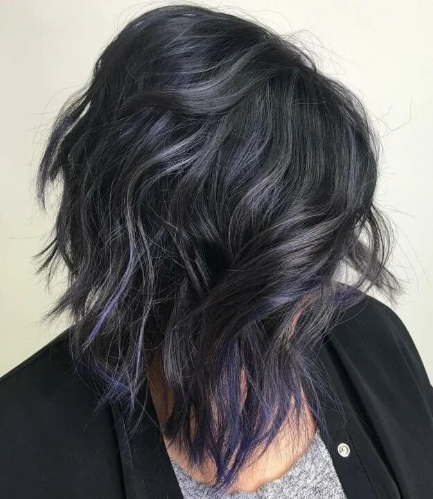 Фіолетові пасма на чорному волоссі – один з наймодніших зимових трендів в фарбуванні. Поєднуйте таке фарбування з модним округлим рваним бобом – вийде неймовірно стильний образ.