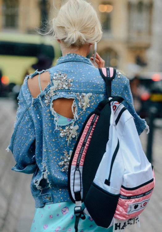 Квіткова аплікація може розташовуватись як по всьому рюкзаку, так і лише на деяких його частинах. Подібна модель найкраще виглядатиме з джинсами, шортами, кедами або туфлями.
