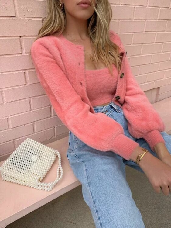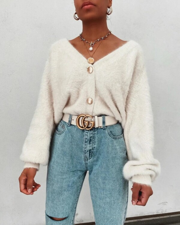 Укорочені кардигани з контрастними гудзиками – ще один стильний тренд, який обов’язково повинна приміряти на себе кожна сучасна леді. Дана річ ідеально виглядає в одному тандемі з низом з високою посадкою.