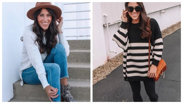 Практичний і стильний тренд, який відкриває цю вибірку – це довгий светр з ажурними візерунками. Дивлячись на нього відразу в голову спадає образ з базовими скінні джинсами, громіздкими черевиками на шнурівці, яскравою шубою Тедді і, звичайно ж, в’язаною шапкою з хутряним помпоном. Родзинкою подовженого светра є те, що його можна сміливо комбінувати з трендовими лосинами, образ в результаті не виглядатиме пошло.