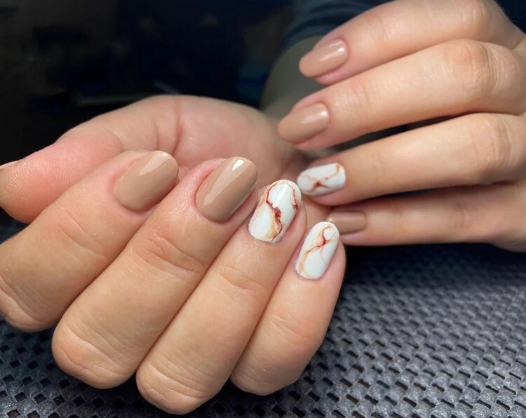 Як ми вже писали вище, природність і мінімалізм в моді. Саме тому в мережі нерідко можна зустріти цікаве поєднання білого і нюдового лаку в дизайні. Часто дізайн доповнюється малюнками, текстурами або звичайним мармуровим малюнком. Ви можете також поекспериментувати з топовим покриттям (матовим або глянсовим), а також декором.