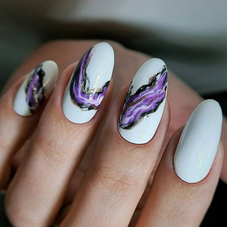 Не могли ми не згадати і про текстури, які в 2021 році знаходяться на піку популярності. Практично кожен 10 дизайн в інстаграмі красується саме з фентезійними текстурами. Деякі імітують камінь, інші нагадують зоряне небо. Білий лак в поєднанні з такими візерунками на нігтях створює дуже стильний і оригінальний манікюр, який прекрасно буде виглядати навіть в діловому образі.
