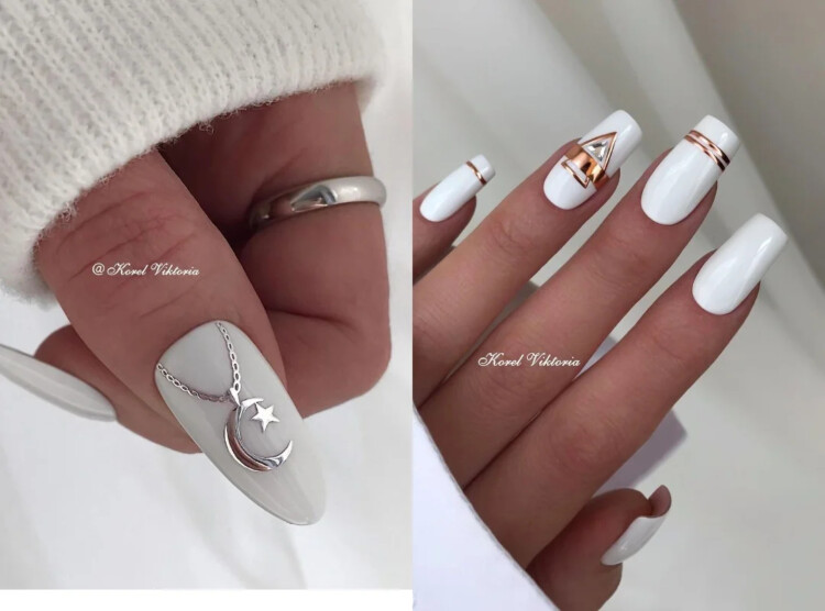Однак з білим покриттям чудово будуть виглядати не тільки золоті, а й срібні акценти. Фахівці радять не перевантажувати дизайн і зупинитися на мінімалізмі. Щоб манікюр виглядав красиво, досить на одній ручці прикрасити один або два нігтики срібними візерунками, які можуть бути створені за допомогою скотч-стрічки, фольги, глітера, стразів або спеціальних наклейок.