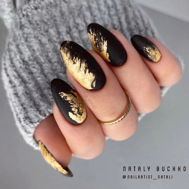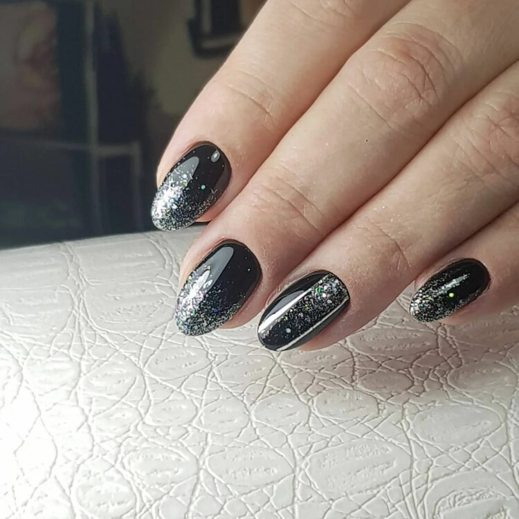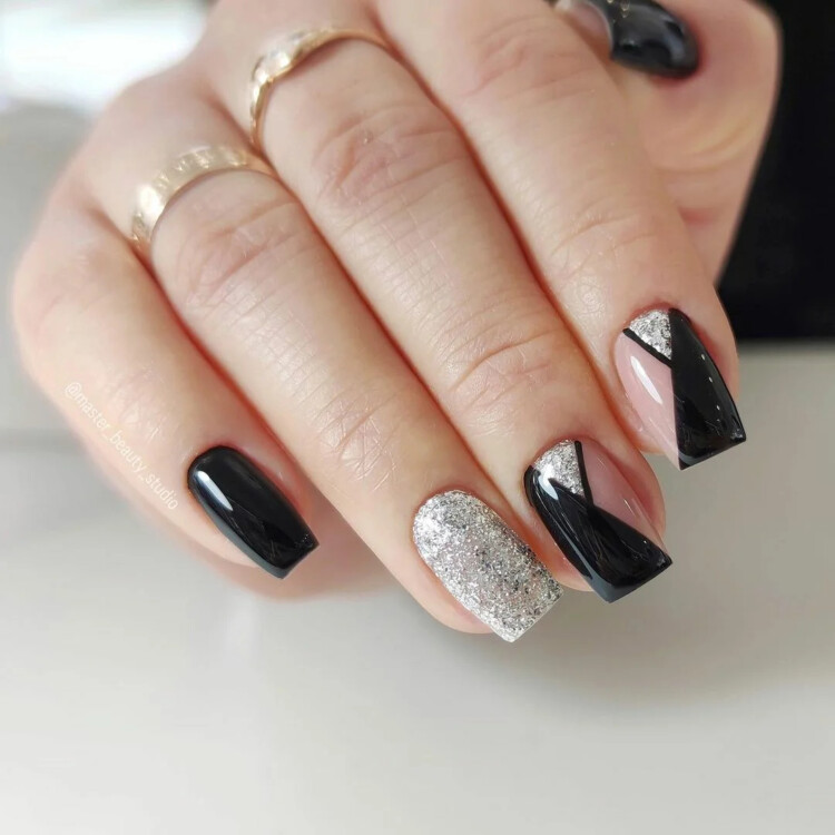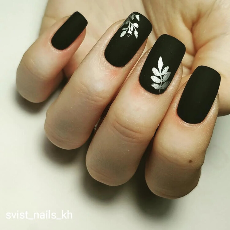 Неймовірно трендово на ваших нігтях буде виглядати чорний манікюр доповнений золотими або срібними деталями. Це може бути звичайна фольга або більш складний в роботі матеріал поталу. Також прекрасною ідеєю може стати гліттер. Золоті та срібні стрази допоможуть створити вечірній нейл-арт. Яскраві деталі зроблять ваш манікюр більш дорогим і статусним і прекрасно будуть працювати як з матовим, так і з глянцевим топом.